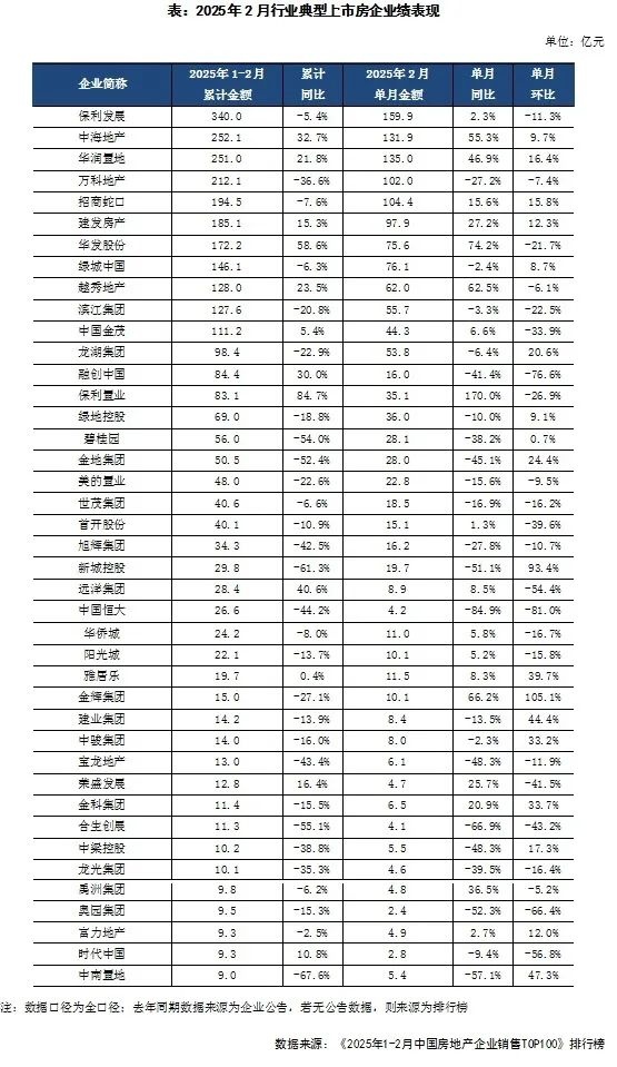 从企业表现来看,2025年2月逾半数百强房企单月业绩同比提升,其中29家企业单月业绩同比增幅大于30%。如中海地产、华润置地、华发股份、越秀地产、中国铁建、保利置业、电建地产等房企表现较好,单月和累计业绩均实现明显增长。