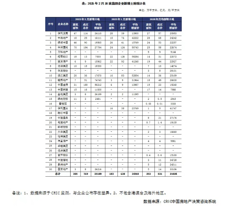 1、核心城市土地成交热度大幅攀升带动重点监测企业投资持续回暖。2月,重点监测30家房企单月投资金额(全口径)接近769亿元,环比增长21%,同比增长83%,其中华润置地单月拿地超过70亿,保利发展、绿城中国接近50亿;30家企业拿地面积305万平方米,同环比分别增长12%和83%。2月成交楼板价虽因结构性因素较1月份大幅下滑,但仍维持在25000元/平方米水平。