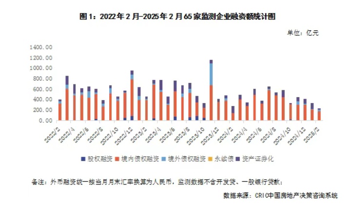 1、融资总量:2025年2月65家典型房企的融资总量为215.88亿元,环比减少34.6%,同比减少22.6%,创近年来的单月新低,融资规模的同环比大减主要是因为春节假期的影响。在融资结构方面,本月房企境内债权融资174.47亿元,环比减少14.1%,同比增加24.9%;境外债权融资36.4亿元,环比增加82%;资产证券化融资5.01亿元,环比减少95.3%,同比减少96.4%。