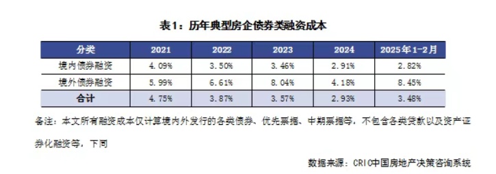 2、融资成本:2025年1-2月65家典型房企新增债券类融资成本为3.48%,较2024年提升0.55个百分点,其中境外债券融资成本8.45%,较2024年全年提升4.27个百分点,境内债券融资成本2.82%,较2024年全年降低0.09个百分点。单月来看,本月境内发行债券的企业主要是保利、美的置业和金茂等优质房企,因此境内债券融资成本环比降低了0.31个百分点至2.69%,整体仍处于低位;而境外则有绿城发行了两笔合共5亿美元的利率为8.45%的境外优先票据,这也是时隔7个月再次有企业发行境外优先票据,上一次要追溯到2024年7月越秀在香港发行绿色票据。