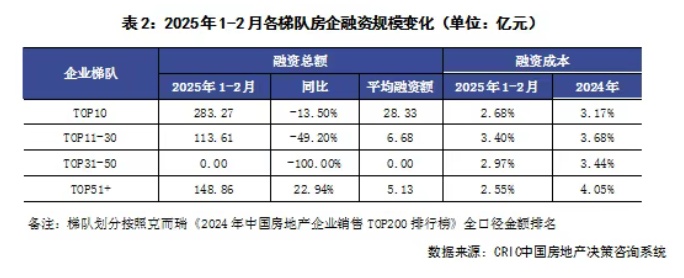 3、企业表现:本月融资总量最大的企业是万科,企业在本月获得了大股东深铁集团提供的合共70亿元的借款。从企业梯队来看,2025年1-2月TOP10房企的平均融资额为28.33亿元,是所有梯队中最多的。TOP51+房企的平均融资额为5.13亿元,同比增长22.94%,该梯队是唯一一个融资规模同比增长的梯队,主要是因为金融街在1月发了一笔46亿元的CMBS,已经相当于该梯队房企在2024年1-2月整体融资规模的三分之一。从融资成本来看,TOP51+梯队的房企融资成本最低,为2.55%,较2024年全年融资成本降低了1.5pct,降幅也是最大,同时比融资成本最高的TOP11-30的房企低0.85pct。