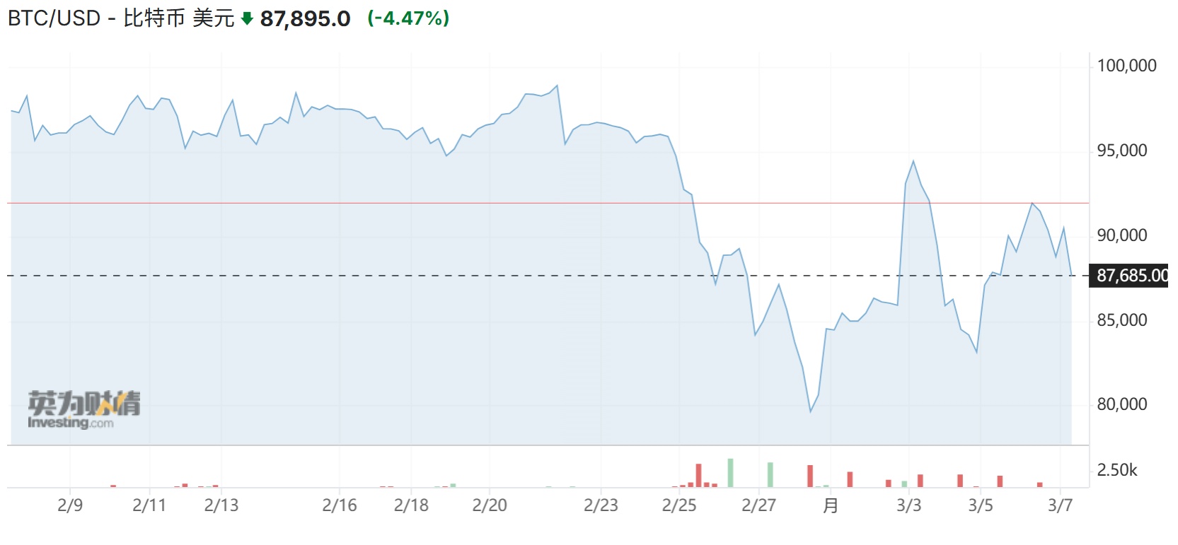 截至发稿,比特币日内跌4.47%,报87895美元/枚。