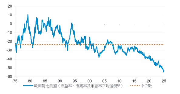 欧洲折让:与美国相比,欧洲股市的估值倍数处于历史低位。在 2025 年 2 月初,MSCI 欧洲指数的 12 个月预估市盈率为 13.3 倍,相比标准普尔 500 指数的 22.3 倍,存在 40% 的折让。在美国,市场非常狭窄,加上与 AI 有关的公司或被认为受惠于特朗普政策的公司带动升势,从而导致估值很高。即使我们通过比较美国及欧洲的等权指数来剔除这些差异,欧洲的估值仍然存在 30% 的折让。美国估值较高部分原因在于投资者相信美国例外论,而欧洲经济前景低迷。经济数据强劲、企业盈利强劲、通胀降温以及货币政策宽松,为美国股市带来支持,但我们开始看到投资者对美国的主导地位有所动摇。相较之下,欧洲的核心通胀受控且利率较低,有助于促使企业增加资本开支并提振消费者信心,投资者对欧洲前景或许过度悲观。因此,任何利好消息都可能为欧洲股市带来上行空间。