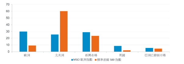 图 2:MSCI 欧洲指数 60% 的企业收入来自欧洲以外