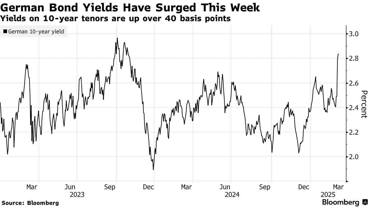 德国将释放数千亿欧元用于国防和基础设施投资,这一重大转变将颠覆其对政府借款的严格控制。这个欧洲最大经济体松开“债务刹车”的前景导致德国政府债券价格在本周大跌。