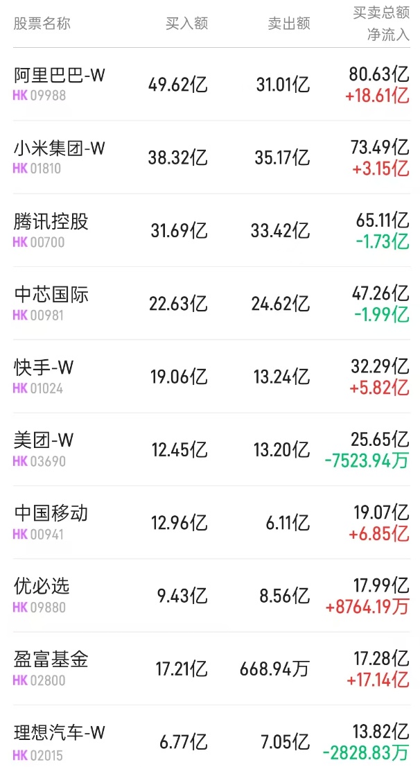北水净买入最多的个股是阿里巴巴-W(09988)、盈富基金(02800)、美团-W(03690)。北水净卖出最多的个股是中芯国际(00981)、中海油(00883)、理想汽车-W(02015)。
