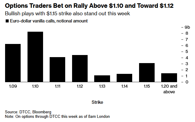 与此同时,美国存托和清算公司的数据显示,欧元兑美元期权交易量在周三创下历史新高,当周看涨头寸占总头寸的70%,而二月的平均值仅略高于50%。据悉,期权交易员押注,欧元兑美元汇率将升至1.10,并可能在明年升穿1.20。