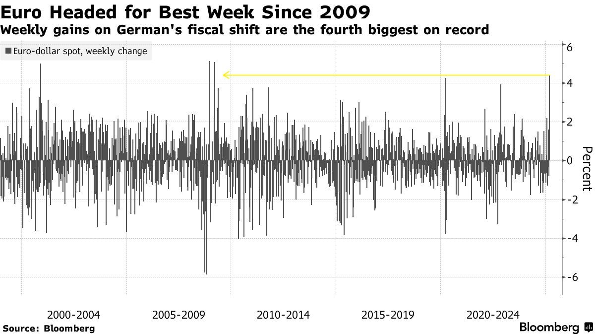 在对德国等欧元区国家增加支出将提振欧元区经济的预期下,欧元应声走高。此外,策略师指出,由于德国及欧盟将安排数千亿欧元的资金,欧洲央行继续降息以刺激经济增长的必要性降低了。这也是欧元近日走强的原因之一。