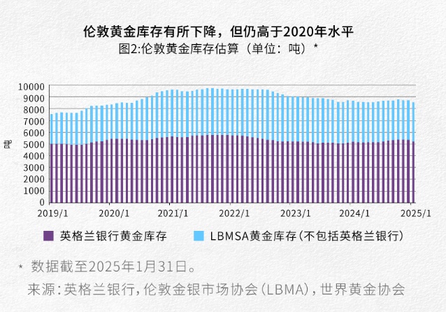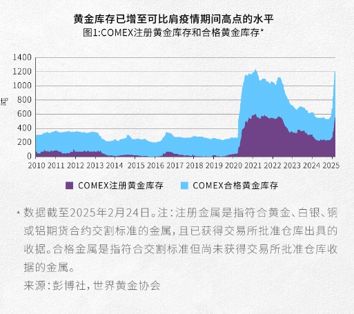 这一趋势一直持续至2025年初。截至目前,COMEX注册黄金库存和合格黄金库存分别增加了近300吨(约900万盎司)和逾500吨(约1700万盎司)。