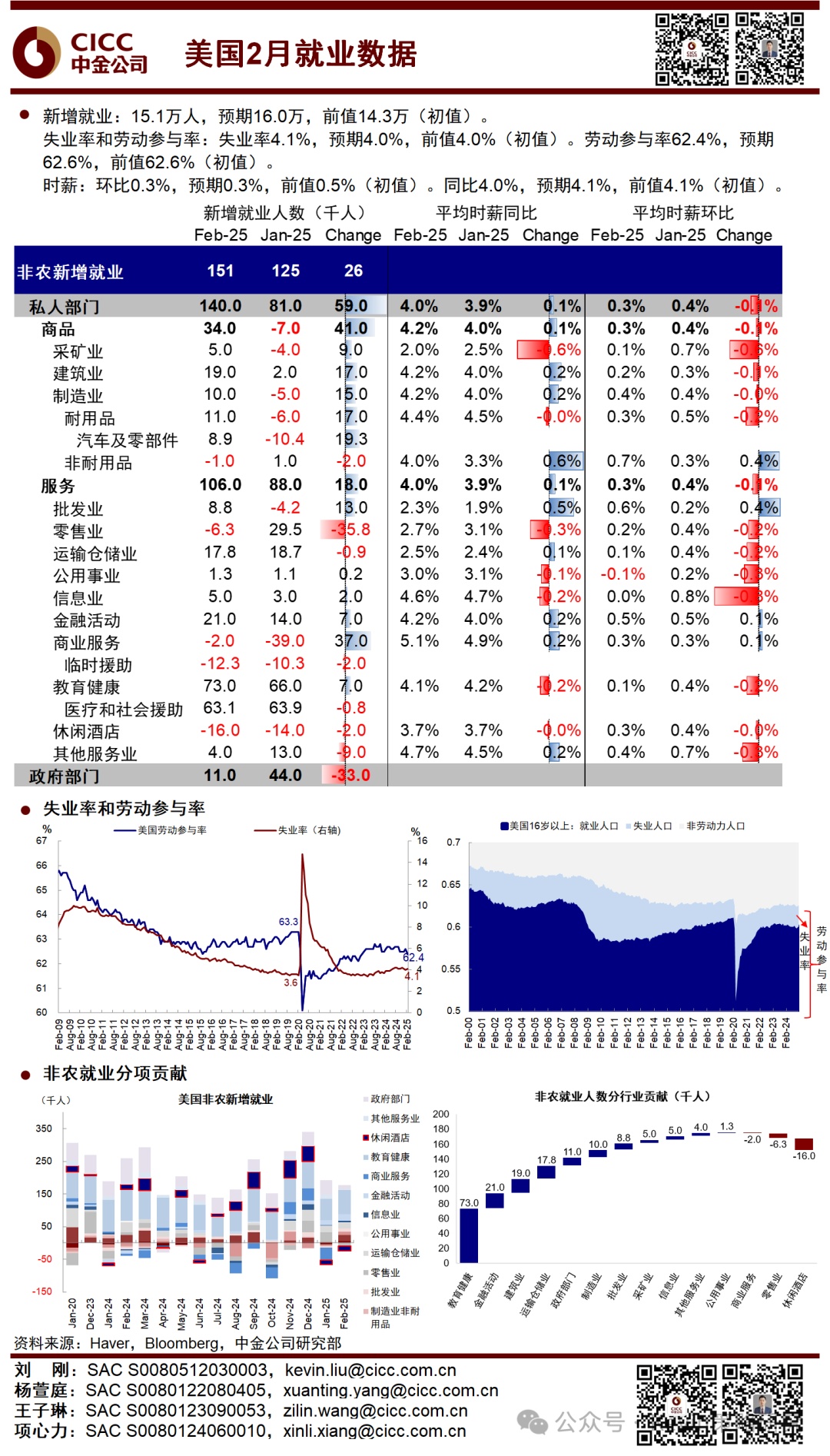 整体看,此次数据低于预期:1)休闲酒店、零售业等拖累,教育健康和金融活动行业为主要贡献;2)失业率由4.0%抬升至4.1%,高于预期的4.0%;3)劳动参与率回落至62.4%,也低于预期和前值的62.6%;时薪同比也超预期回落至4.0%;4)前值下修:1月新增就业由14.3万下修至12.5万,时薪环比由0.5%下修至0.4%,同比也由4.1%下修至3.9%。