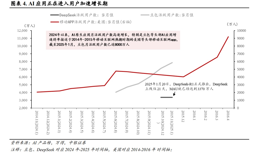 由上,可以看出,AI应用增长斜率已接近于2014-2015年移动互联网热潮时期的美团等头部移动互联网app,头部应用如豆包等或有望在2025年实现月活破亿,头部AI应用正在走向从量变走向质变的“奇点时刻”。而随着国内AI应用用户数正在进入加速增长期,DeepSeek的推出有望进一步加速应用端商业化落地。