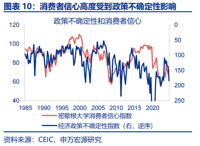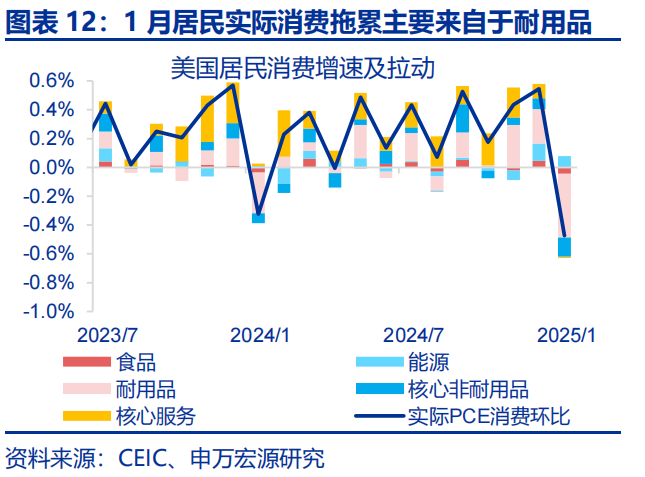2)1月美国消费“硬指标”数据走弱,主要由于消费意愿下降,而非收入拖累。2025年1月的零售销售、PCE消费数据大幅弱化,从结构上看主要为耐用品回落较大。从驱动力来看,美国1月居民收入增速是改善的,显示收入并非消费的约束,而是消费意愿。年初天气因素可能对美国居民消费造成较大冲击,但零售销售中网购部分同样走弱,显示天气并不是全部因素。关税政策不确定性及美股市场年初大幅波动可能对美国居民消费意愿形成抑制。