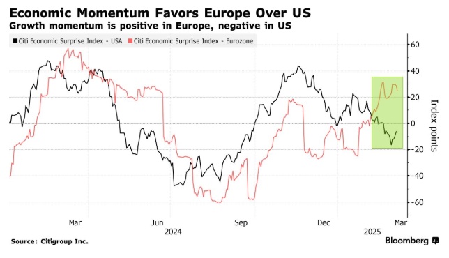 就在美国通胀和经济增长不确定性增加之际,欧洲的政治前景却突然稳定下来。德国正力争实施大规模刺激计划,欧洲大陆在国防开支问题上团结一致,乌克兰有可能停火,企业盈利预计将改善。