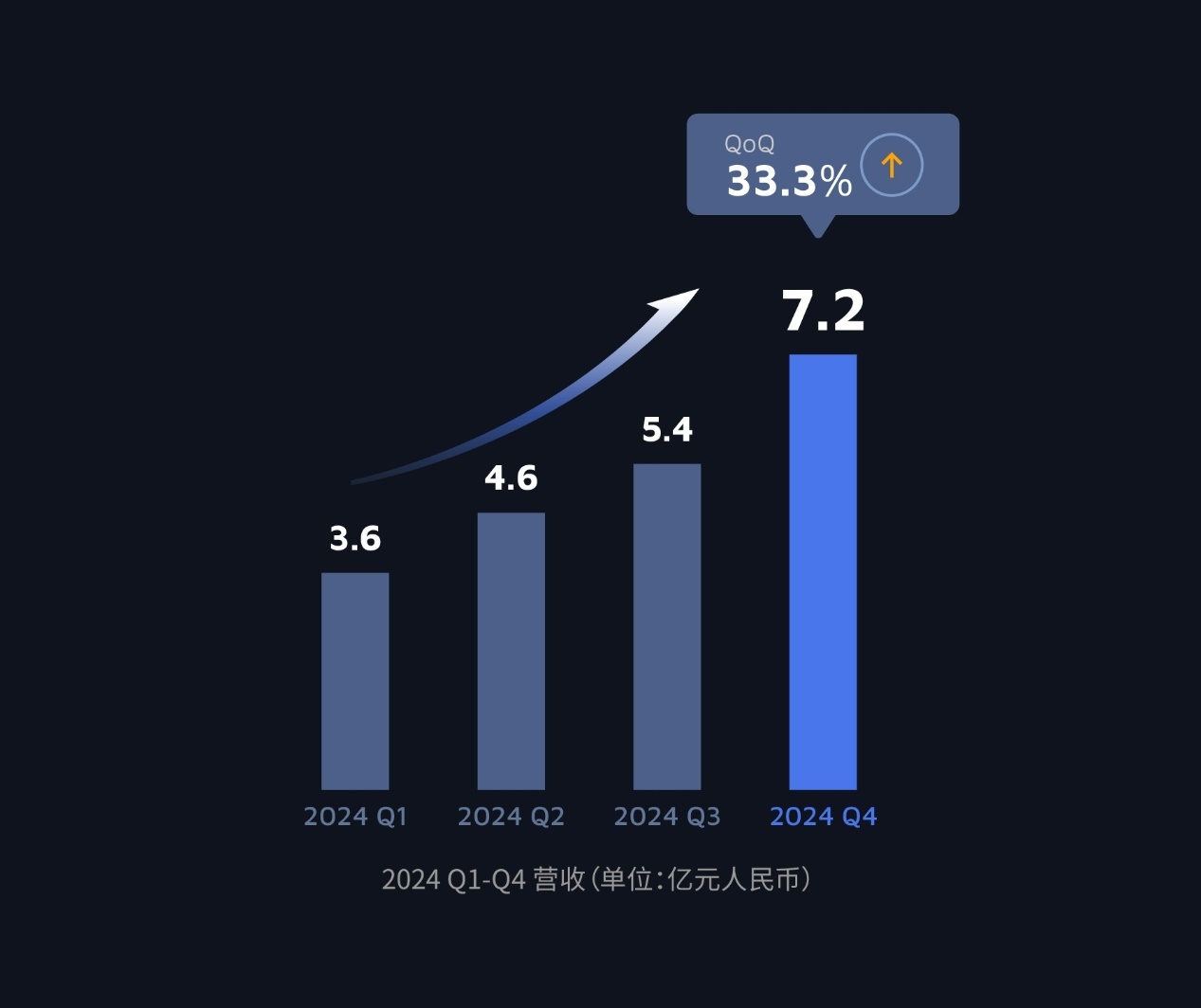 数据显示,去年Q4期间公司收入同比大增28.3%至7.2亿元,环比口径增幅更是高达33.3%。全年视角下,2024年禾赛实现营收20.8亿元,同比增速为10.7%;Non-GAAP净利润1400万元,成功扭亏为盈,这亦使其成为到目前为止全球唯一实现全年盈利的上市激光雷达企业。