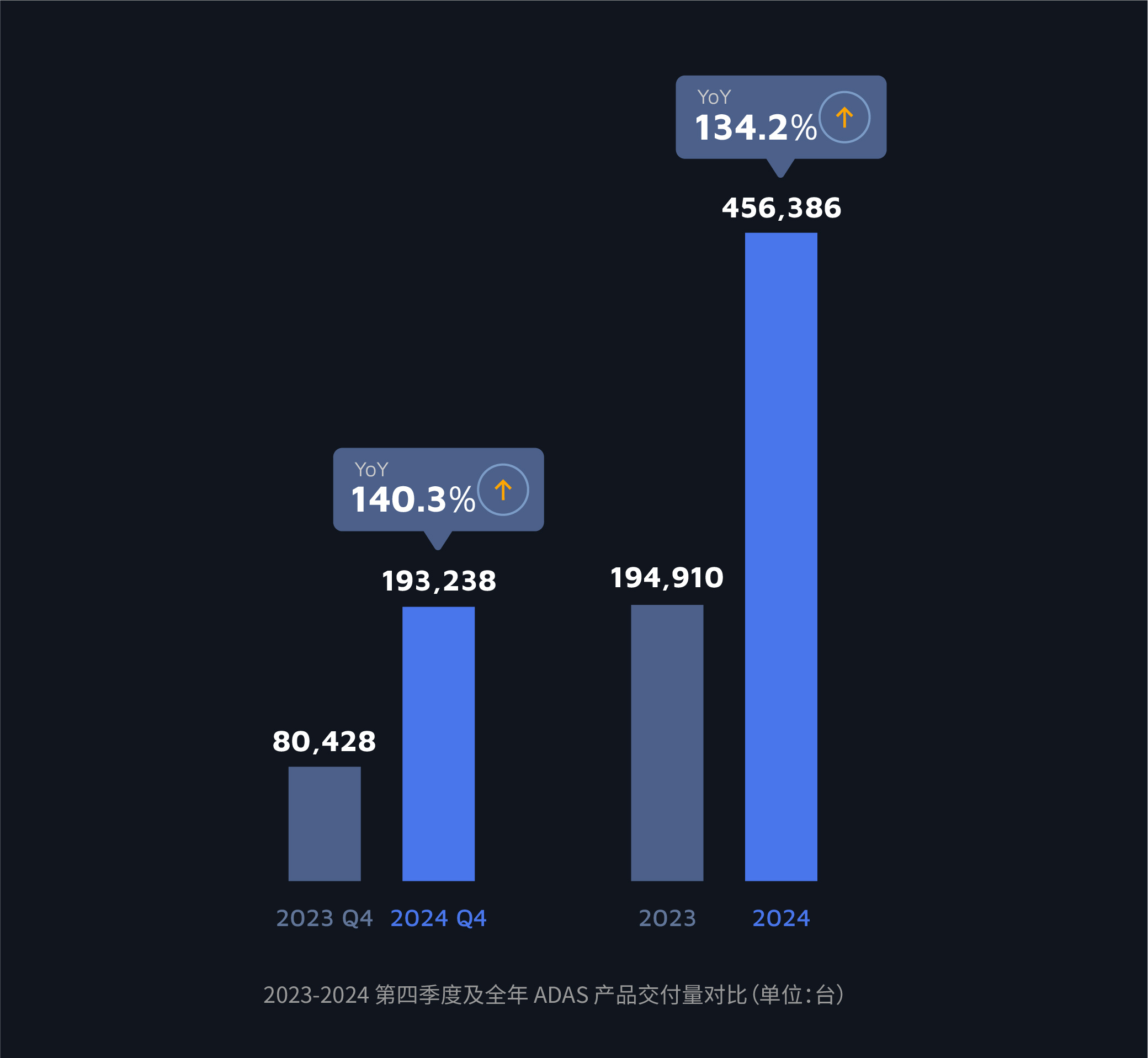 技术突破与成本下探同时深入演绎,反映到市场端自然是产品交付情况继续“高奏凯歌”:Q4期间,禾赛ADAS产品交付量为193,241台,同比增加140.3%;全年ADAS激光雷达交付量为456,386台,同比增加134.2%。
