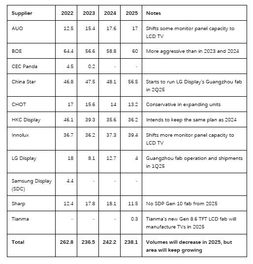 2025年,液晶电视面板制造商不计划增加出货量,而是希望增加其出货面积,这意味着他们将专注于出货更多65英寸及以上尺寸的面板。