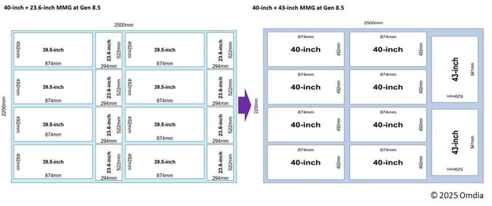 京东方一直在其福清8.5代TFT-LCD产线套切生产40英寸电视面板和23.6英寸显示器面板。然而,这种23.6英寸的显示面板副产品并不容易被显示面板和电视面板消费者接受。因此,京东方决定在其福清B10 8.5代产线采用新的MMG套切方法。新的MMG套切将包括八片40英寸电视面板和两片43英寸电视面板。京东方最初在其B10产线采用双曝光工艺(中文称为“双头龙”)生产10片43英寸电视面板。因此,为了减少23.6英寸副产品的影响并实现40英寸面板的生产,京东方将其40英寸+23.6英寸MMG套切更改为40英寸+43英寸MMG套切方法。一旦京东方在2025年第一季度开始采用40英寸+43英寸MMG套切,它将在2025年逐步淘汰40英寸+23.6英寸MMG套切生产。