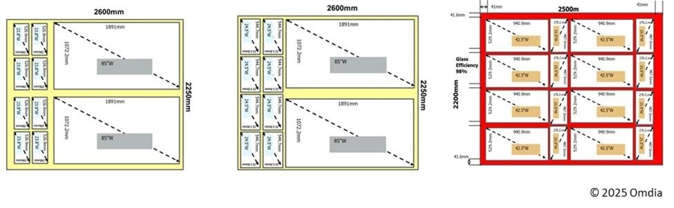 另一方面,中国大陆液晶面板厂商还可能增加以上三种套切生产方式,以提高43英寸和85英寸面板的生产量。43英寸面板的生产将从10.5代转移到8.5代和8.6代,而85英寸的生产将增加超大尺寸的供应。
