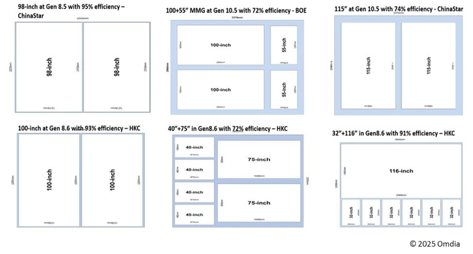 当前10.5代TFT LCD产线的主要产品是43英寸、65英寸和75英寸面板,因为这些尺寸在10.5代线上生产,具有较好的经济化玻璃利用效率。