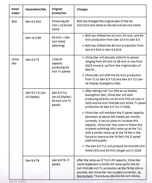 由于大尺寸液晶电视面板的强劲需求,面板厂商正在对其8.5代、8.6代和10.5代产线的产品组合进行一些调整。这些变化如下: