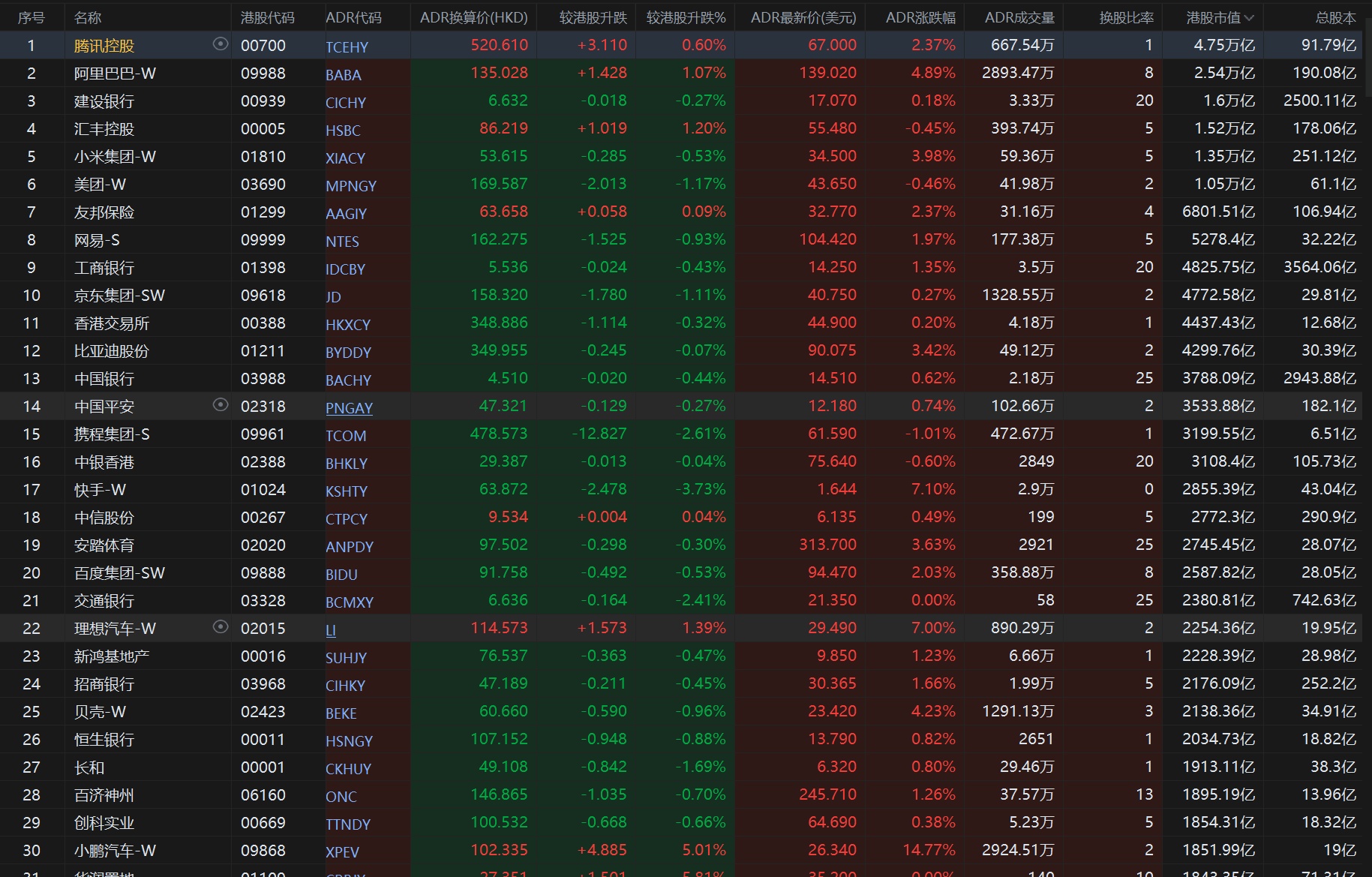 智通财经APP获悉,周二美股三大股指集体下跌,恒生指数ADR下跌,按比例计算,收报23722.66,较香港收市下跌59.48点或0.25%。