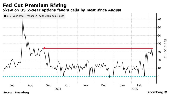 期权交易员预计,这种风险将加大美联储在未来几个月降息以提振经济的压力。这导致对两年期美国国债看涨期权的需求增加,如果美联储采取更激进的利率政策,这些看涨期权将带来回报。这些看涨押注的溢价已升至去年9月以来的最高水平,当时就业增长放缓引发了人们对经济放缓的担忧。