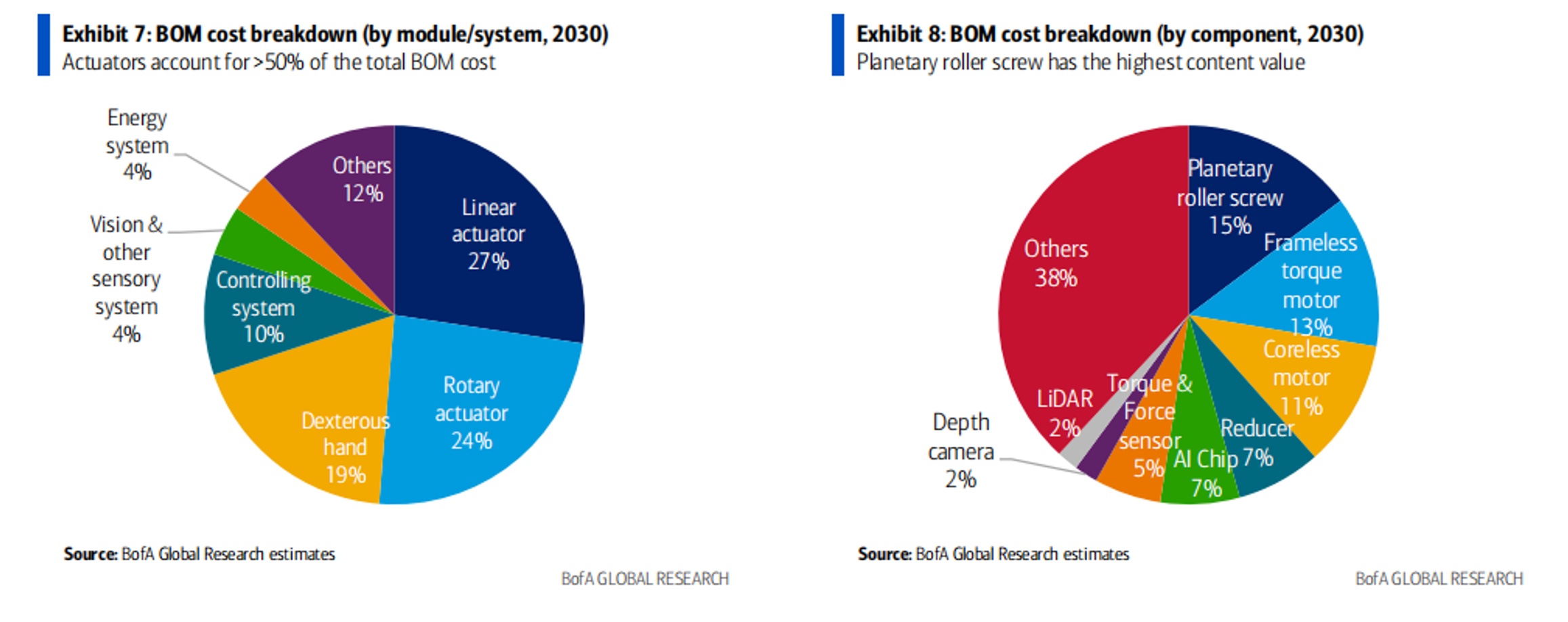 美银分析也指出,灵巧手、执行器模块、传感器系统、控制系统等将构成人形机器人产业的关键组件。美银还对人形机器人的零部件成本结构进行了详细分析。预计到2030年,执行器将占据总物料成本的50%以上,其次是灵巧手,占比19%,视觉及其他传感系统则占比4%。