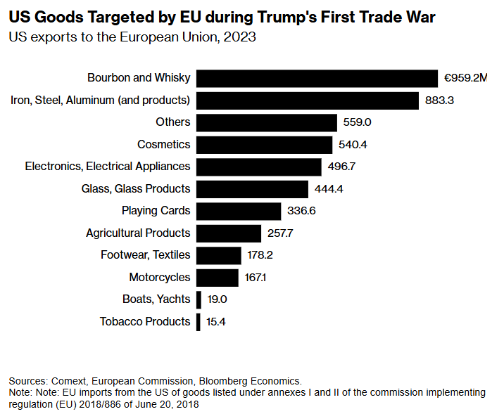 布鲁塞尔此前表示,将对美国的任何举动采取迅速和相称的报复,并已连续数月研究制定多份将要打击的商品清单。这些清单包括来自某些美国选区的政治敏感产品,旨在给美国带来比欧洲经济更大的经济损失。