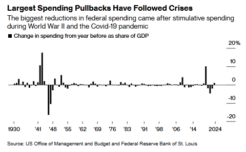 马斯克提议的如此大规模的支出削减在现代美国历史上也几乎没有先例。唯二更大的削减发生在二战结束后和2022年,当时特朗普和拜登在2020年和2021年主导的疫情刺激支出有所减少。