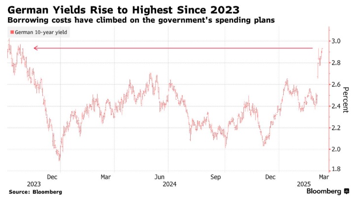 智通财经APP获悉,德国基准国债收益率正逼近3%的关键心理关口,如果超越3%大关,这将是过去18个月以来的首次超越。随着市场预期德国政府将出现历史性的大规模债务扩张与发行浪潮来支持经济增长与国防安全建设,欧洲债券市场投资者们的抛售情绪在近期显著升温,德国国债价格可谓大幅承压。