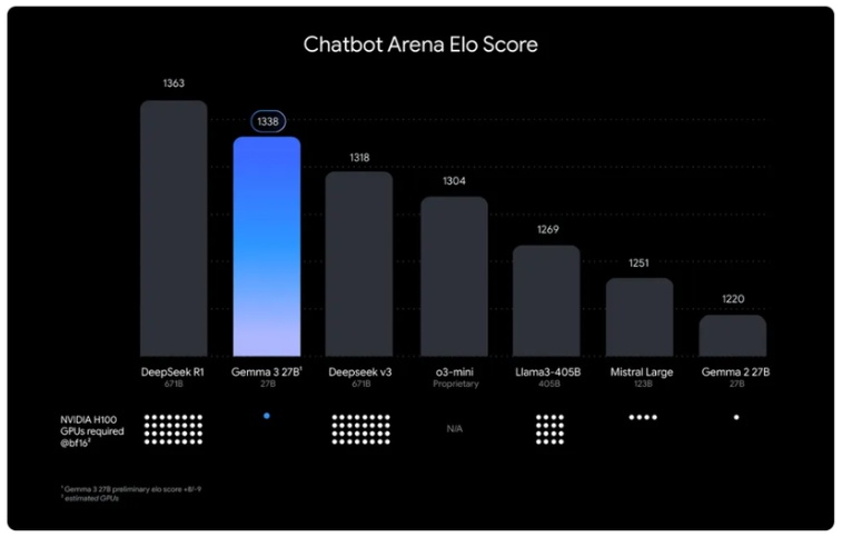 根据排名,只有Deepseek的R1模型比Gemma 3得分更高。