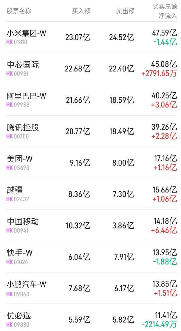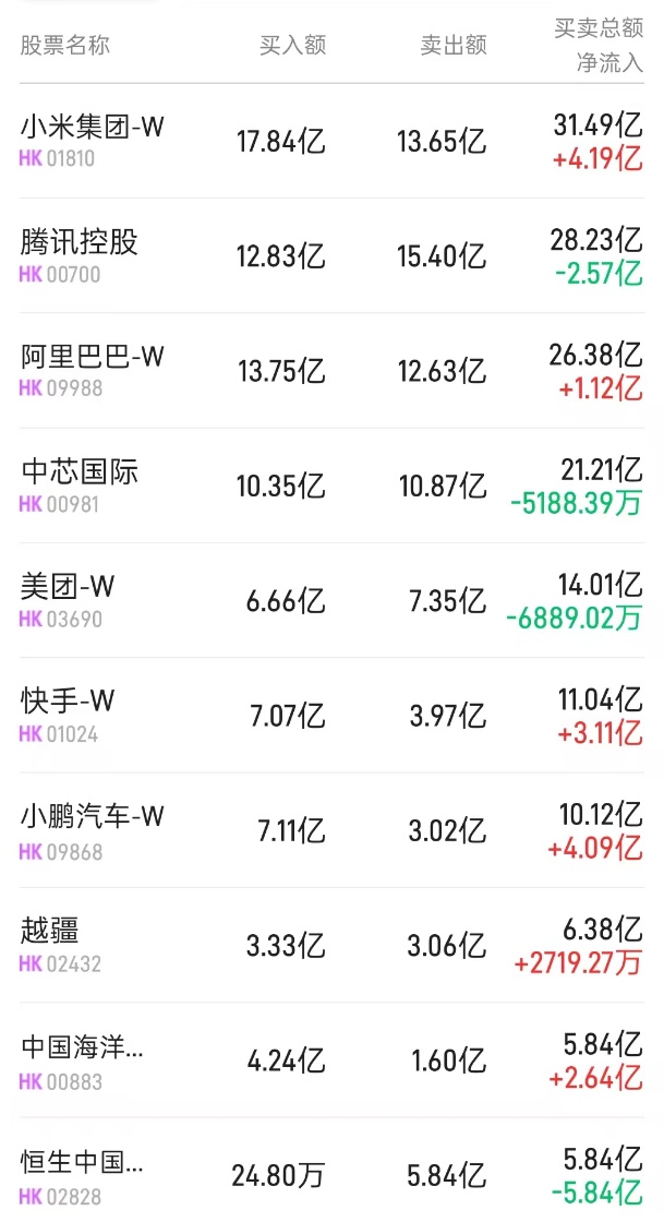 此外,小米集团-W(01810)、美团-W(03690)分别获净买入2.74亿、4700万港元。而恒生中国企业(02828)、腾讯(00700)、中芯国际(00981)分别遭净卖出5.83亿、2901万、2396万港元。