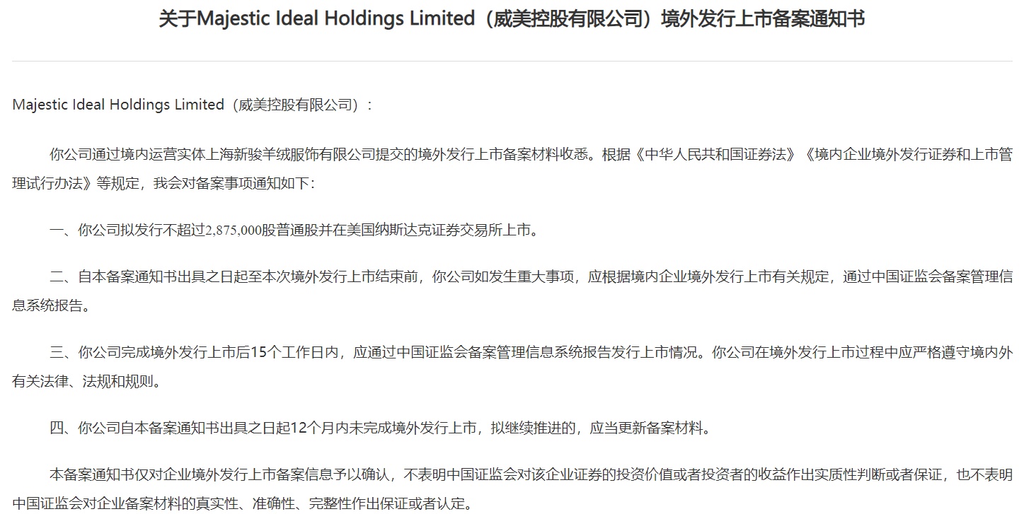 智通财经APP获悉,3月13日,证监会发布《关于Majestic Ideal Holdings Limited(威美控股有限公司)境外发行上市备案通知书》,威美控股有限公司(MJID.US)拟发行不超过2,875,000股普通股并在美国纳斯达克证券交易所上市。
