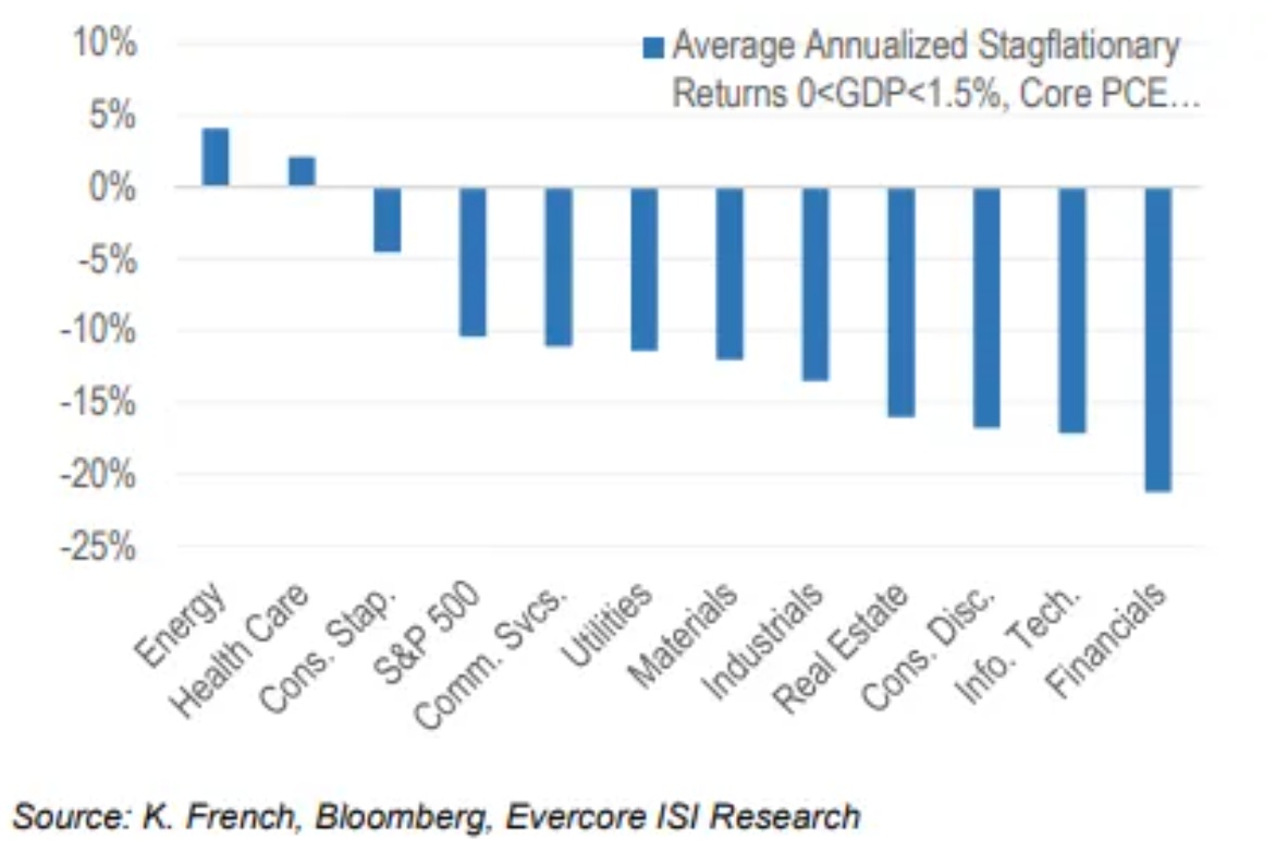 Evercore表示,当美国国内生产总值年增长率降至1.5%以下,而通胀(核心PCE)升至3%以上时,就会出现滞胀。这种情况将引发该公司的看跌预期,标准普尔500指数可能会从目前的5600点左右跌至年底的5200点。