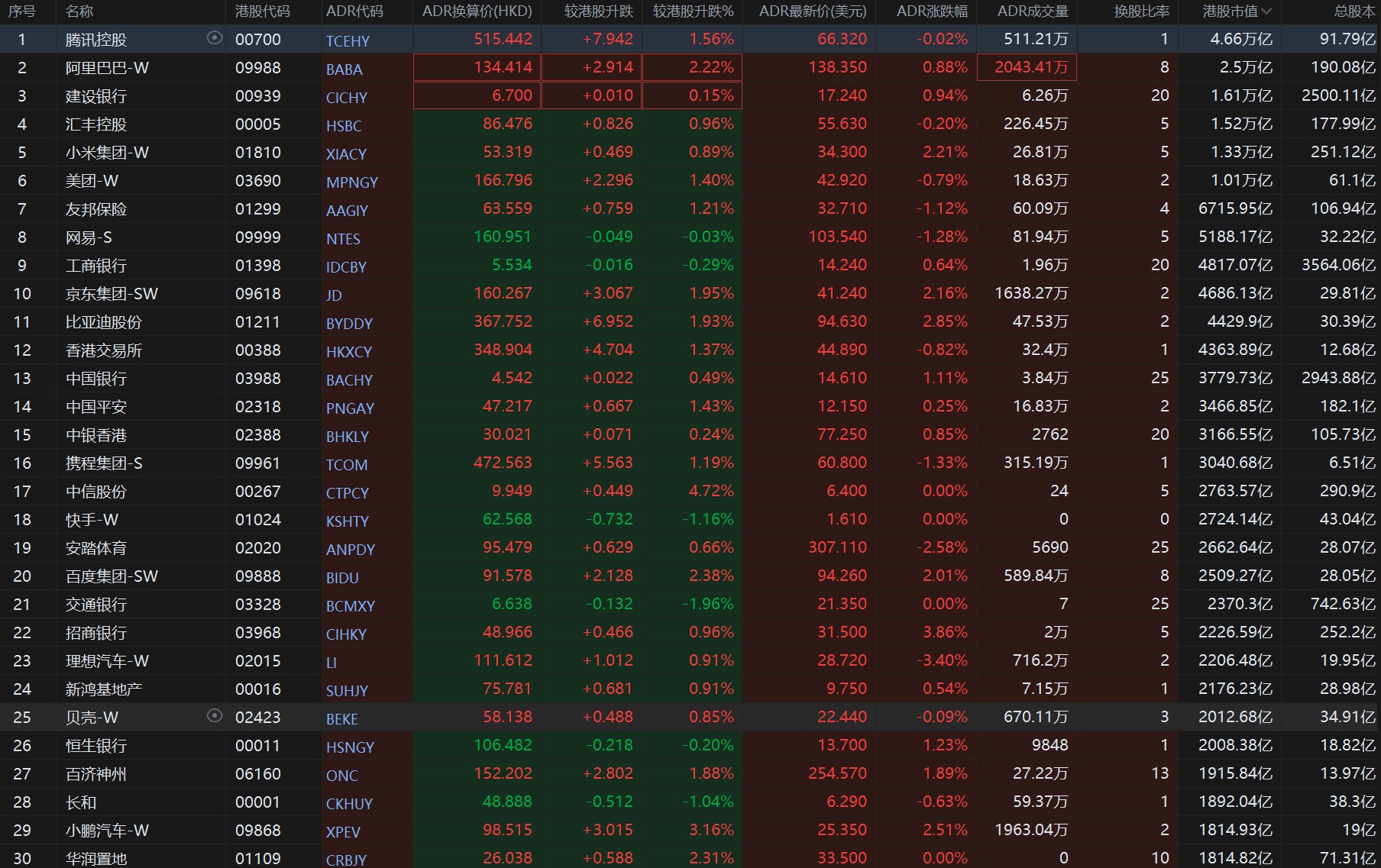智通财经APP获悉,周四美股三大股指齐跌,恒生指数ADR上涨,按比例计算,收报23662.34,较香港收市上涨199.69点或0.85%。