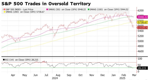 由于担心总统的贸易政策会阻碍经济增长,标普500指数自2月份达到峰值以来已经蒸发了约5万亿美元的市值。由于投资者对大型科技股的高估值提出质疑,纳斯达克100指数已从上月的高点下跌逾10%。