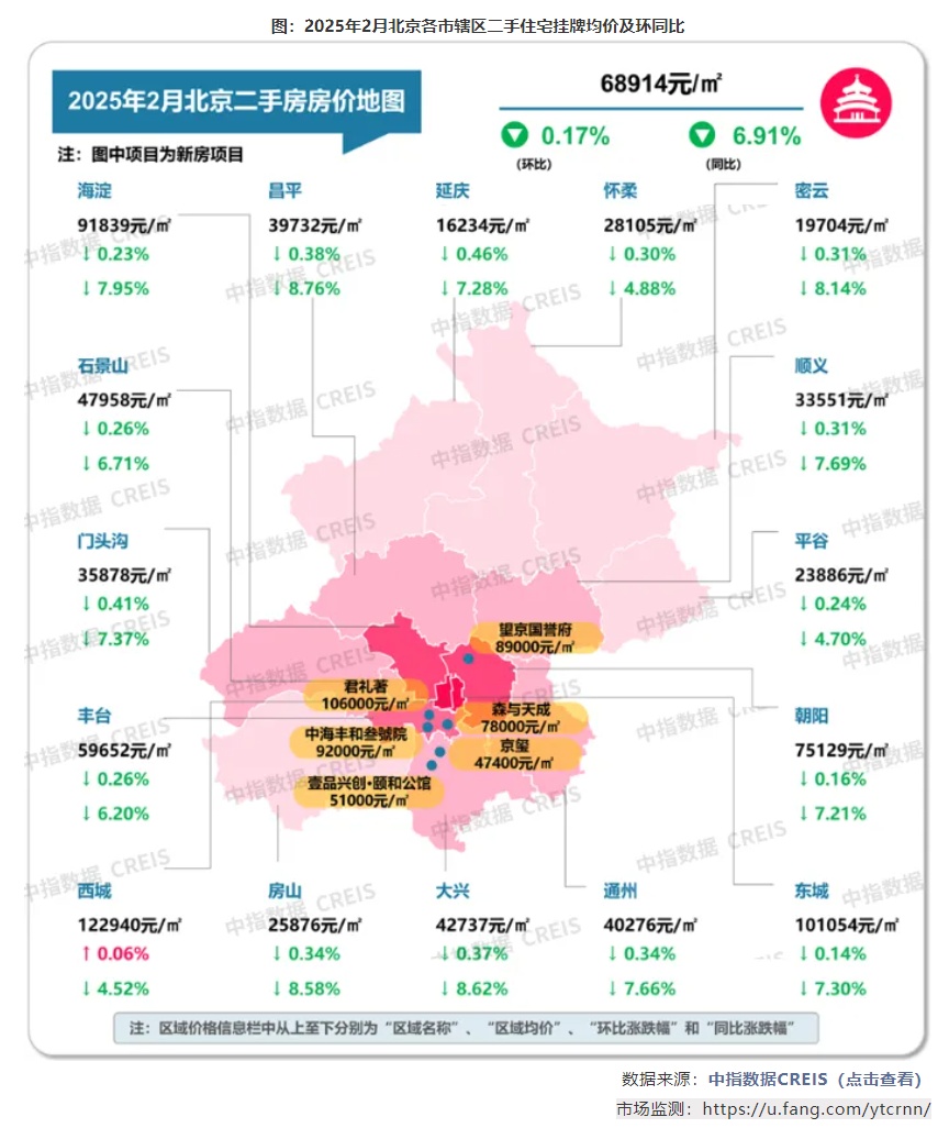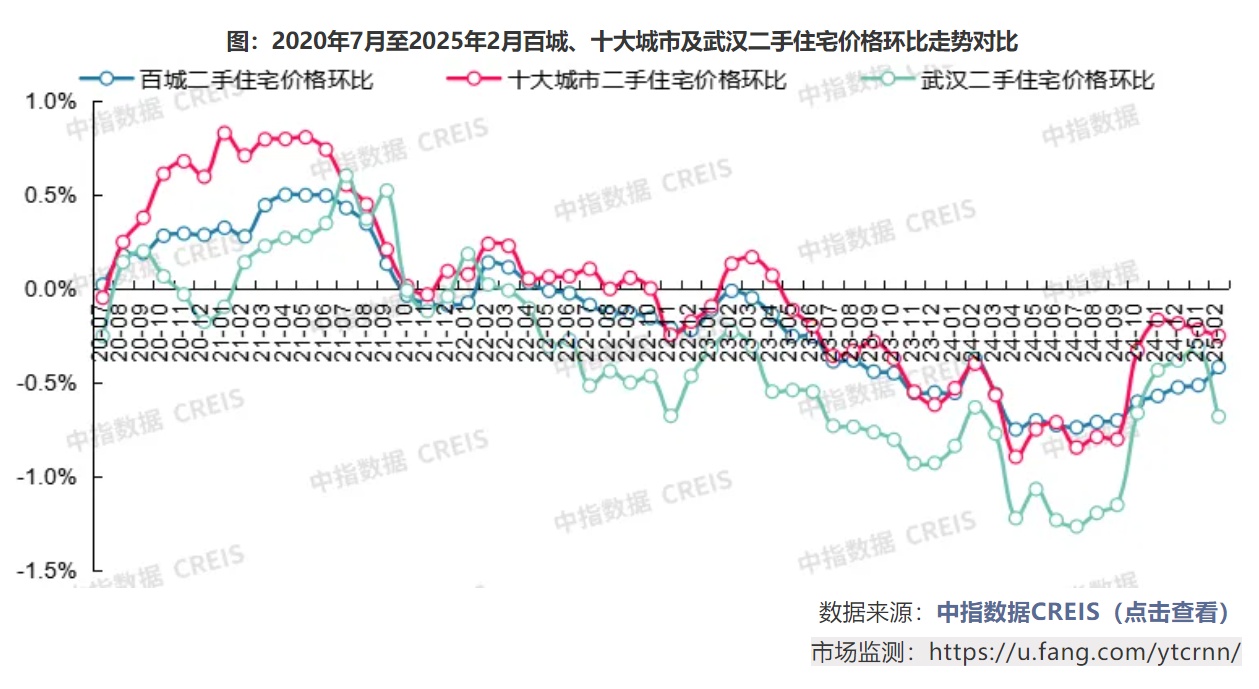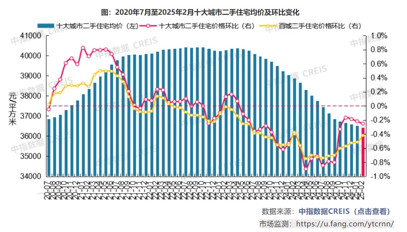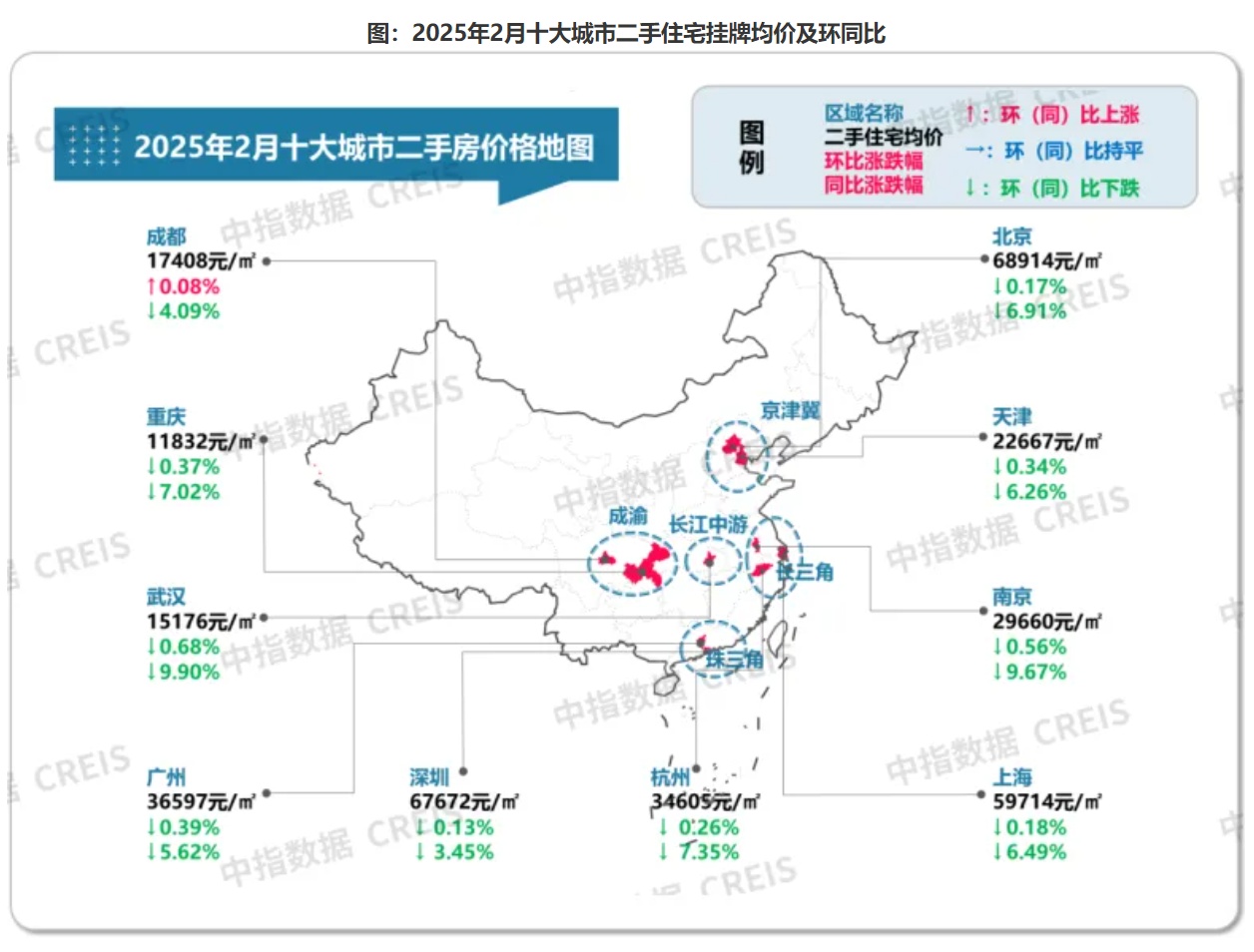 智通财经APP获悉,中指研究院发文称,2月,重点城市二手房成交量同比普遍保持增长,价格跌幅继续收窄。根据中国房地产指数系统百城价格指数,2025年2月,百城二手住宅均价环比下跌0.42%,跌幅收窄0.1个百分点,同比下跌7.26%;十大城市二手住宅均价环比下跌0.25%,同比下跌6.32%。