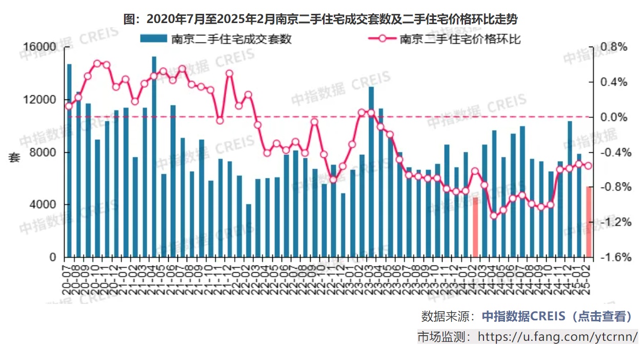 成交方面,春节节后,购房者看房积极性和置业意愿有所提升,市场信心有所修复。但由于南京二手房挂牌量处于高位,议价空间较大,买方市场特征仍明显。2月,南京二手住宅成交7847套,低基数下同比增长17.7%,1-2月累计同比增长5.2%。价格方面,2月,南京二手住宅价格环比下跌0.56%,跌幅较上月基本持平。