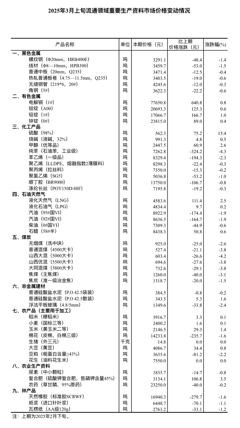 智通财经APP获悉,3月14日,国家统计局发布2025年3月上旬流通领域重要生产资料市场价格变动情况。据对全国流通领域9大类50种重要生产资料市场价格的监测显示,2025年3月上旬与2月下旬相比,16种产品价格上涨,32种下降,2种持平。其中,生猪价格为14.8元/千克,较上期持平。
