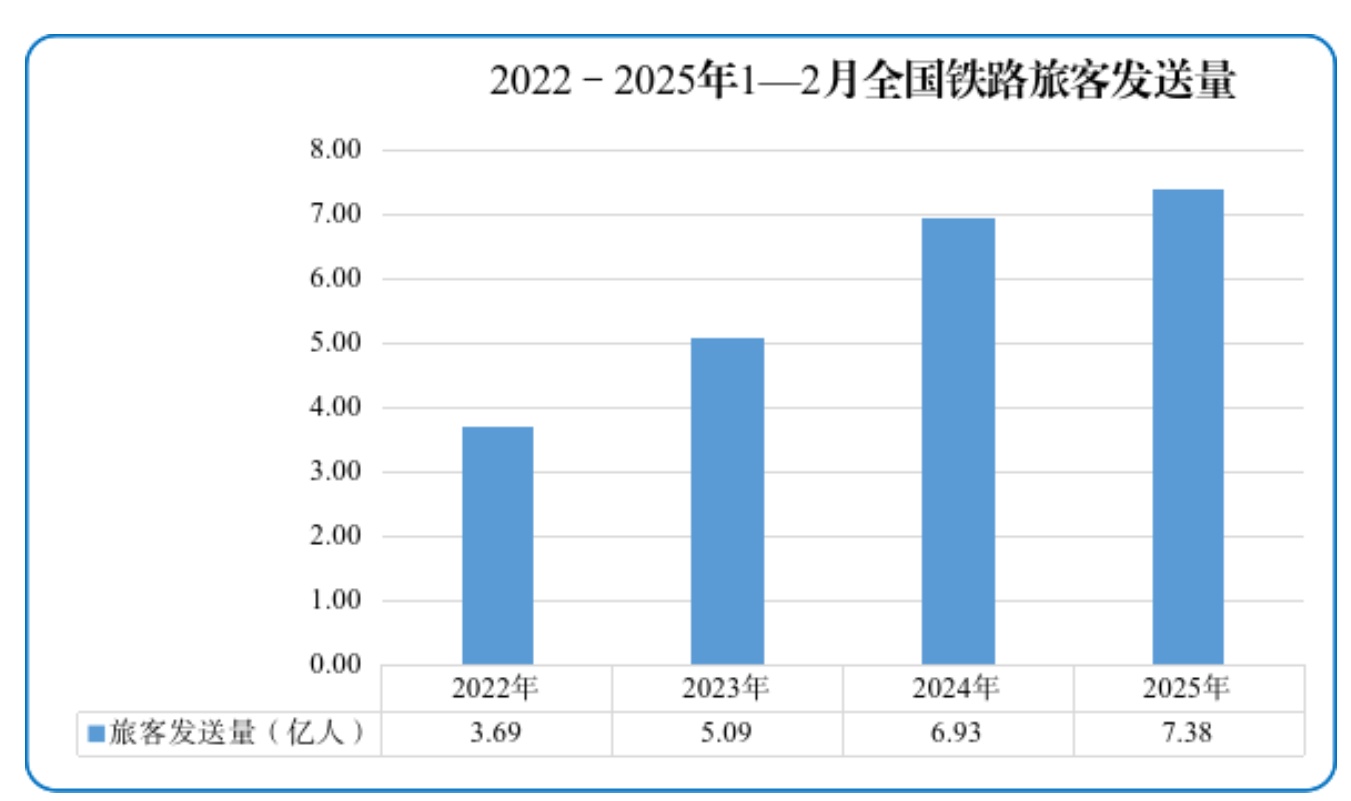 2025年1—2月份,全国铁路旅客发送量创历史同期新高,货物运输畅通有序,为经济平稳运行提供了有力支撑。