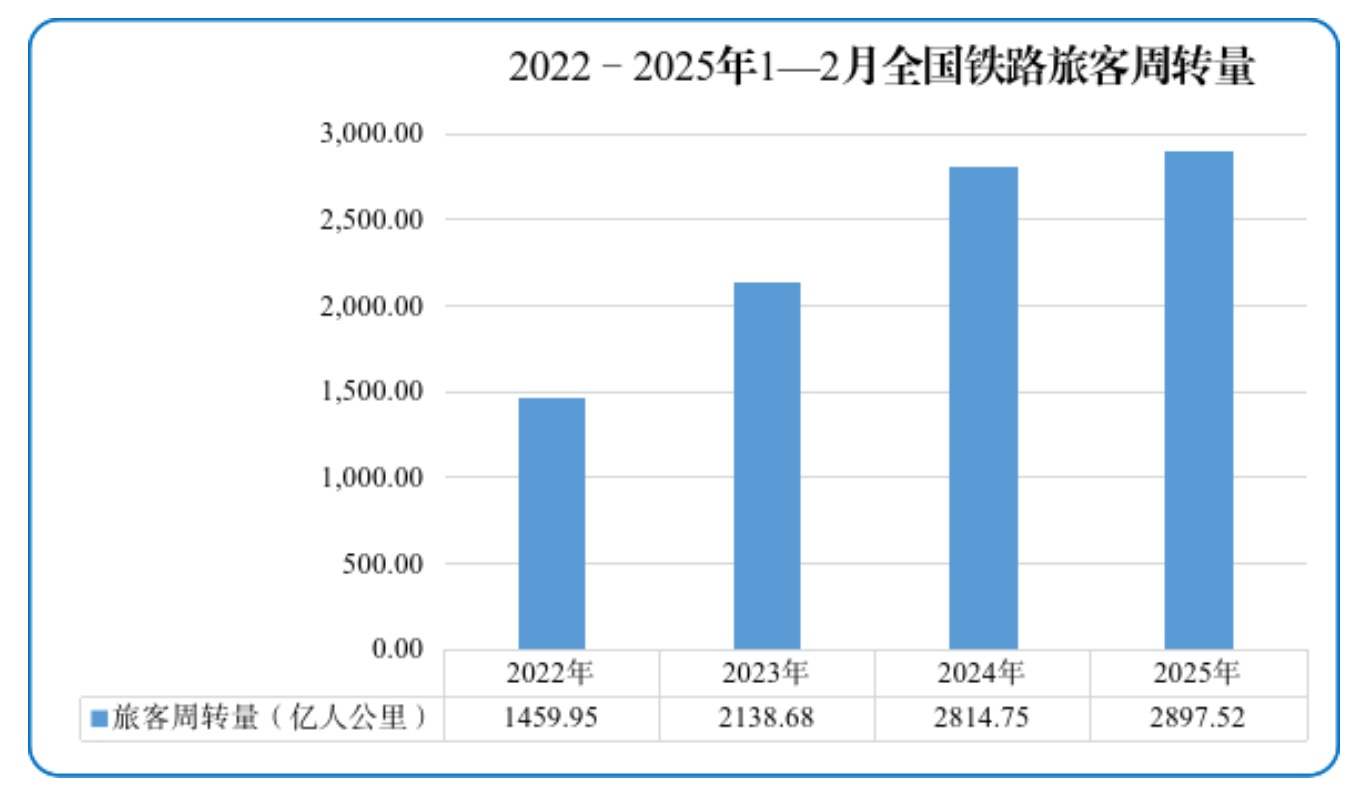 图2 2022—2025年1—2月全国铁路旅客周转量