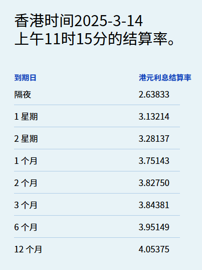 智通财经APP获悉,3月14日, 港元拆息连续三日全线向下,其中,隔夜息微跌至2.63833%,为1月17日后最低,而一个月和三个月拆息连跌三天,齐创一个月新低。