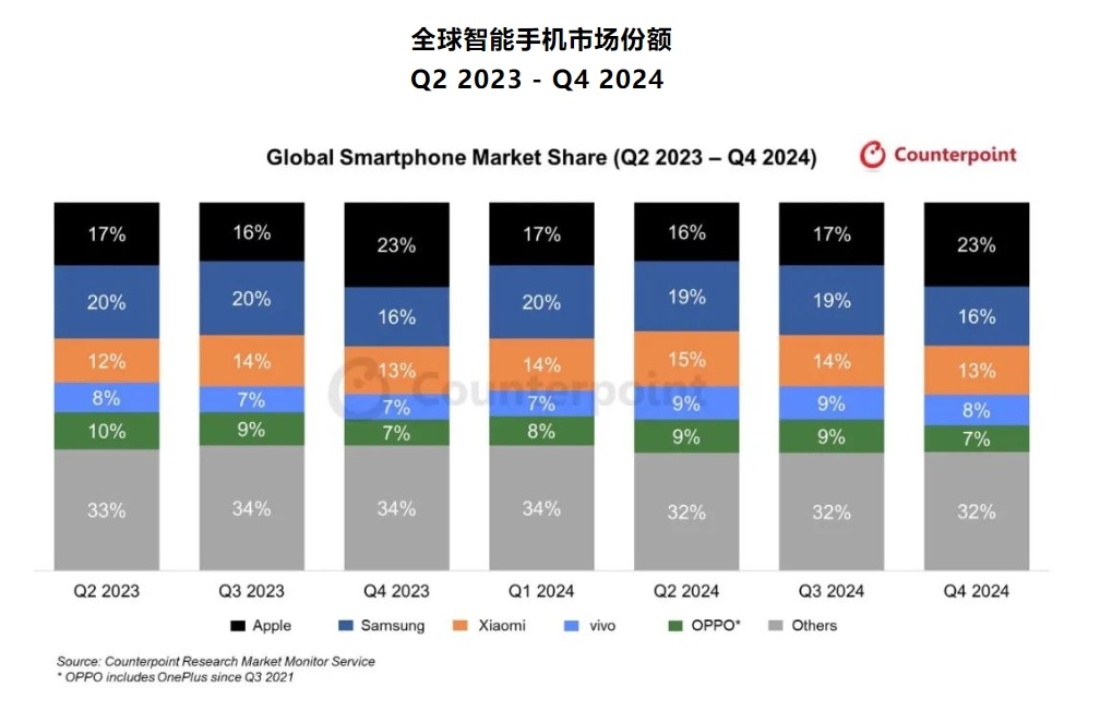 智通财经APP获悉,Counterpoint 发文称,尽管 2024 年 Q4 全球智能手机市场整体持平,但全年仍实现 4% 的增长,主要得益于加勒比和拉美以及欧洲市场的增长。苹果(AAPL.US)以 23% 的市场份额领先 2024 年 Q4 全球智能手机市场,三星以 16% 的份额位居第二。小米(01810)排名第三,出货量同比增长 5%,而 vivo 同比增长 13%,成为 2024 年 Q4 前五大品牌中增长最快的品牌。OPPO 在 2024 年 Q4 出货量同比下降 3%,但在中国、拉美和西欧市场表现良好。