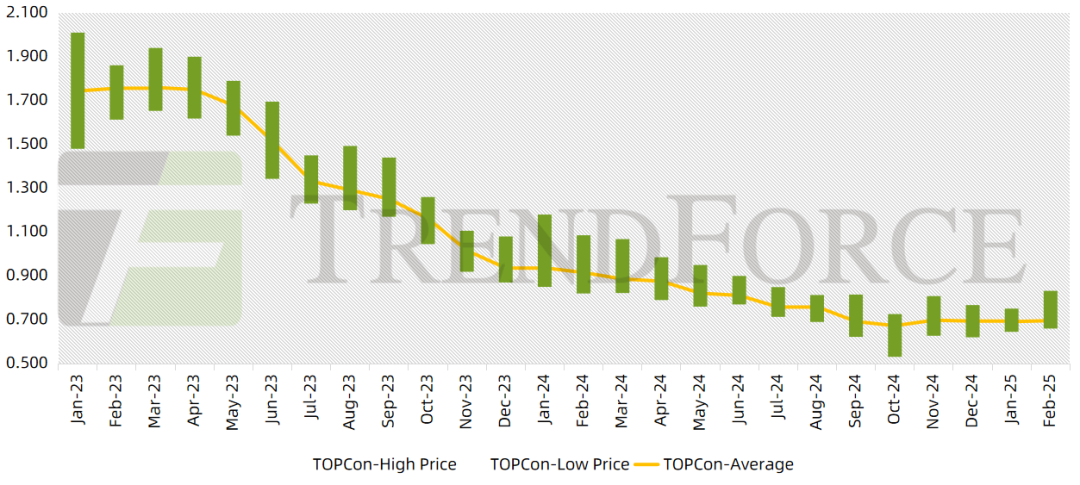 图:2023年-2025年2月N型TOPCon组件月度开标价格趋势分析(元/W)