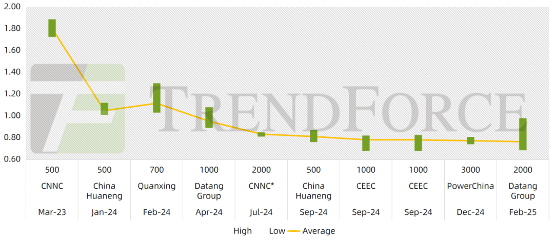 2025年2月主要是大唐集团有限公司2025-2026年度 19.5GW N型TOPCon组件项目开标,投标价格在0.66元/W-0.832元/W,均价为0.696元/W,较上月(1月开标均价为0.694元/W)上涨0.65%。据了解,共有44家企业投标,若以中国光伏协会公示的光伏组件综合成本单价0.692元/W为水位线来看,约有12家企业投标单价低于此标准;而光伏龙头TOP4组件企业再度保持一致,给出0.705元/W的报价。在大型央国企集中采购招标流程中,多轮报价协商与价格谈判属于常规环节,采购方往往会结合第三方平台数据实施动态定价机制,因此即便供应商初始报价金额一致,最终执行价格仍可能存在实质性差异。此外需注意上述报价不含运费,按运输距离1.9分/1000公里计算运费。