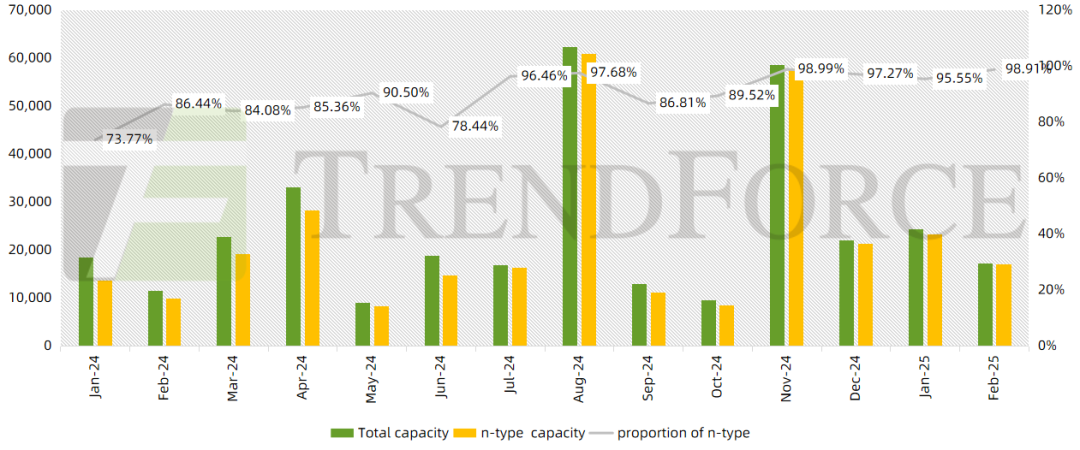 智通财经APP获悉,3月14日,据TrendForce集邦咨询中国光伏产业招投标数据库统计,2025年1-2月光伏组件招标量约41.7GW,同比+38%,其中N型组件招标约40.4GW,占比97%。