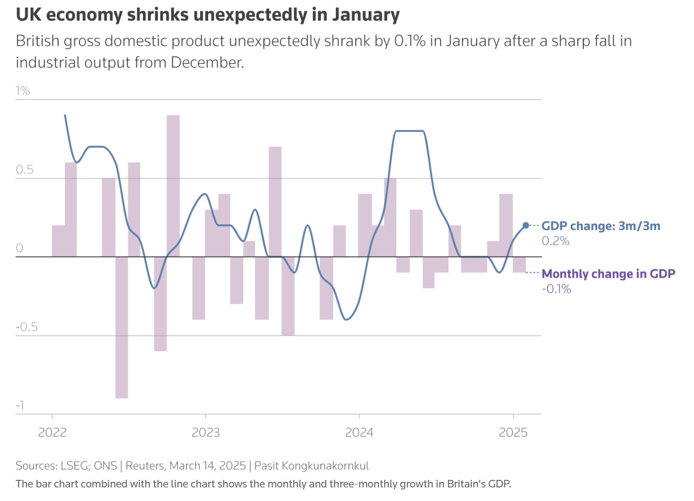 智通财经APP获悉,英国经济1月意外收缩,在英国财政大臣雷切尔•里夫斯向议会提交经济前景更新报告之前,这一系列时好时坏的数据使她刺激增长的尝试受挫。英国国家统计局周五表示,1月份国内生产总值下降0.1%,工业产出较12月大幅下降是主要拖累因素。