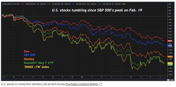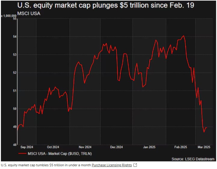 据了解,特朗普政府的混乱贸易政策,给消费者、企业和投资者带来了巨大不确定性,经济衰退风险悄然上升。短短不到一个月,美国股市市值蒸发约5万亿美元,科技巨头首当其冲,股价大幅下挫。