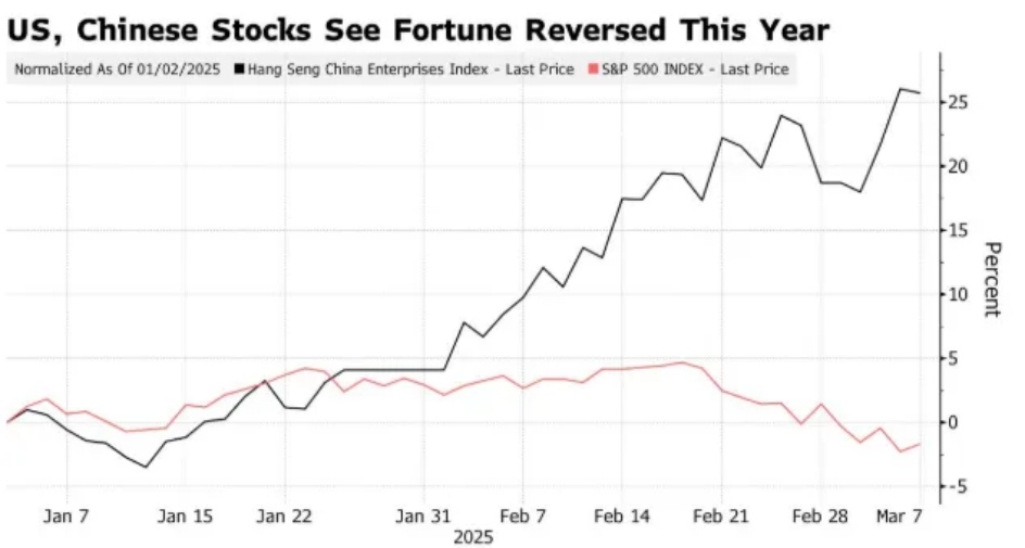 近日,恐慌指标Cboe波动率指数(VIX)一度迈向30,触及去年8月以来的最高值。而标普500指数也于近期跌破市场密切关注的200日移动均线支撑位,这也是自2023年11月以来首次。另外汇丰、花旗近日下修美股评级,理由则是关税带来的不确定性。而另一方面,花旗集团同时将中国股市评级上调至增持,并称美国例外论至少暂时暂停。