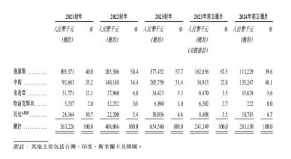 近年来,俄罗斯市场成为了舒宝国际快速增长的主力,2021-2023年,该地区收入占比分别为40%、50.4%和57.7%。从舒宝国际产品销售情况来看,2021-2023年以及2024年前5个月,在舒宝国际的婴童护理用品销售中,分别约45.9%、63.8%、80.1%及70.3%销往俄罗斯。